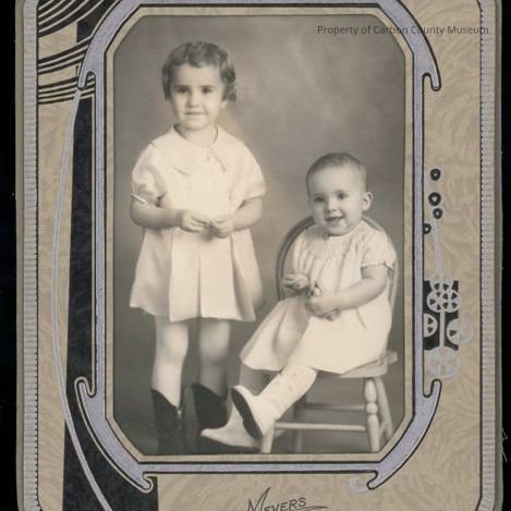 3X5 photo of two children in white dressed and boots. Taken in Rawlins by Meyers.