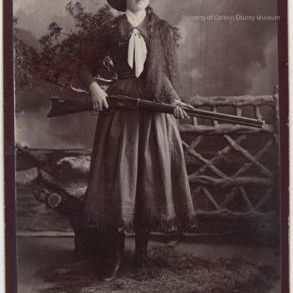 Black & white print on brown mat of a young woman holding a rifle across her front. She holds the butt in her right hand and the barrel in her left. She is wearing a dark below the knee dress with fringe on the hem line. A white scarf is tied at her neck & hangs to her waist. She has on a wide brimmed, light colored hat, her hair is very long & hangs over her left shoulder. Studio prop background & she stands on artificial grass.