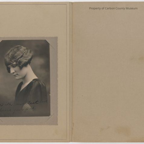 Photo mounted in folder that opens like a book. Written on bottom of photo in black ink: "With sweetest love from your pal."