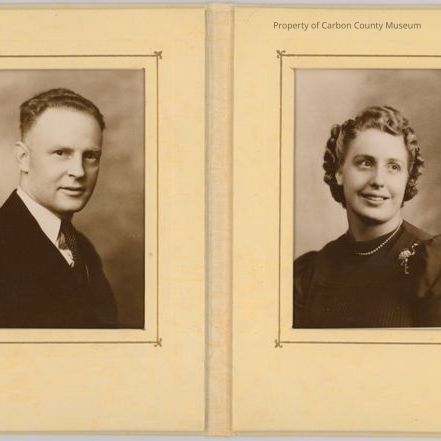 Update 2008: Sepia prints. Two bust photos in a book styled folder. Photo on left side is of a man in a dark three piece suit. He has on a light colored shirt and small polkadot tie. His hair is combed back in waves and is medium dark. The photo on right side is a lady in a dark dress with no collar but rounded neck line. She has on a single strand of pearls and has flamingo pin on the right shoulder of her dress. Her hair is a medium light color an has waves and curls. Style is short.