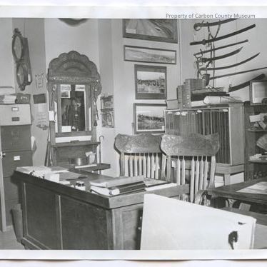 Written on back in blue ink: "#7 Interior of Carbon County Museum located in Carbon County Court House Rawlins, Wyo" "Museum photos to go with a story to be written by Ed Tierney"