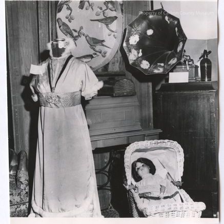 View 1: On photo left is an upholstered chair with steer horn arms & legs, a dress on a form, birds in frame, a phonograph, sewing machine & doll in a wicker buggy.