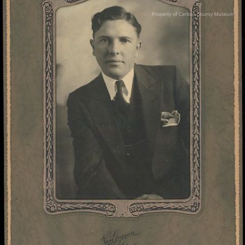 Update 2008: Black and white print. Bust photo of a man in a dark colored three piece suit. He has on a dark colored tie and white shirt. There is a handkerchief exposed in his right jacket pocket. His jacket is unbuttoned. His hair is parted on the right and waves over to the left.