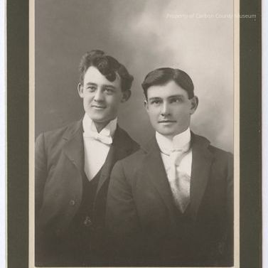 Black & white studio portrait on a dark grey mat. Image of two well dressed men in three piece suits & white, high, stiff collar shirts. The man on the left is wearing a white bow tie & the man on the right has on a long tie with very wide bottom which is lightly patterned. The man on the left has a dark full head of hair with curls on top. He also has a watch fob hanging from his vest. The man on the right has dark hair parted on his left & combed down.
