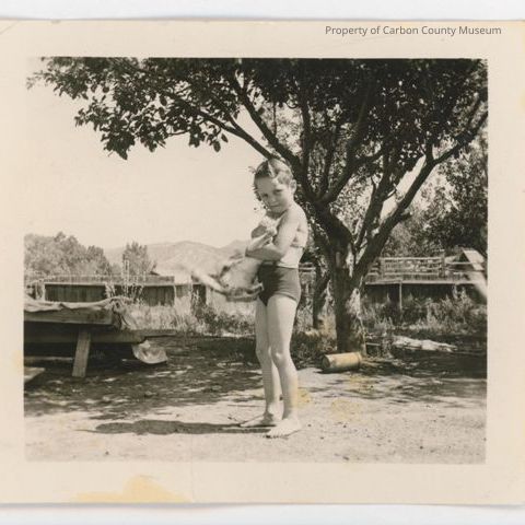 Update 2008: Black and white print. Photo of young child in a swim suit holding an unhappy cat. Child has short dark colored hair. Left background is a big tree in front of a bridge. Right background is a building. To the right of the child is a table. Child is standing barefooted on the ground.
