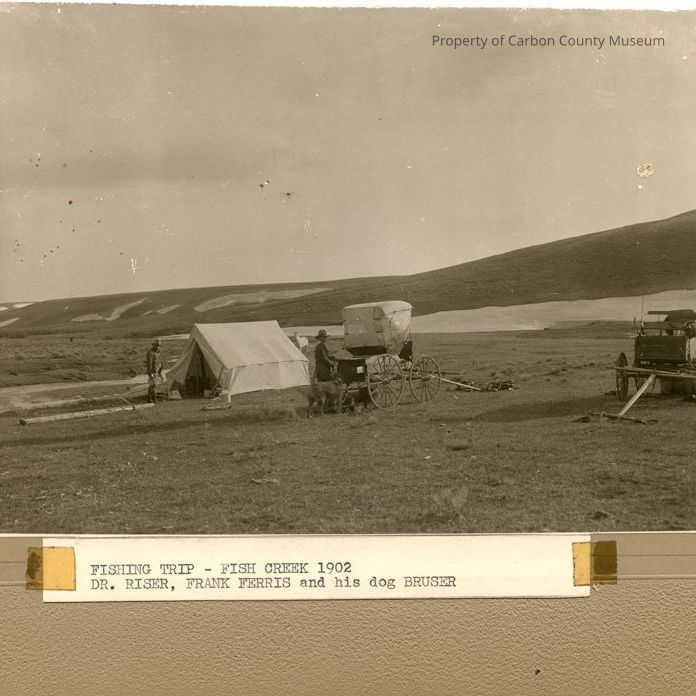 A type caption on ivory paper taped with yellowed tape reads: Fishing trip-Fish Creek 1902. Dr. Riser5, Frank Ferris and his dog Bruser.