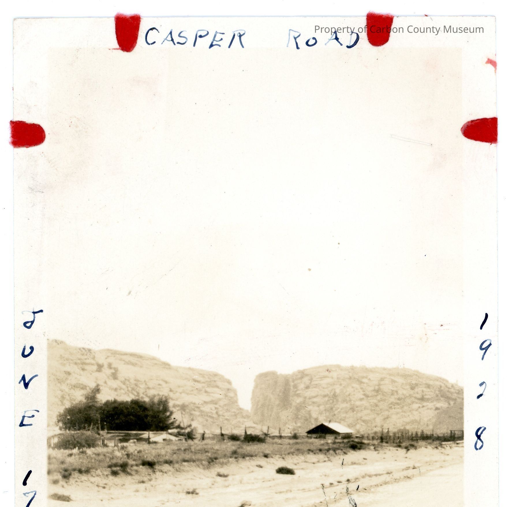 Sepia tone photograph. A dirt road with some vegetation and a house visible in the midground, two large hills are visible in the background. Written along the top edge of the photograph is "CASPER ROAD", along the bottom "Where Cattle Kate was hung", vertically along the left "JUNE 11", vertically along the right "1928". The number 15 is printed on the reverse, also present is a circular green stamp that reads "MEYERS PHOTOS PHOTO FINISHING RAWLINS, WYO".Collection