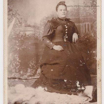 Update 2008: Sepia print. Photo of a lady in a dark colored dress sitting sideways on a chair. She is facing right with her right arm on back of chair. Left arm in her lap. Dress skirt is dark colored with ruffles around bottom. Skirt is long. Blouse of skirt is lighter colored than skirt and has big buttons up the front. Bouse has long sleeves that puff at shoulder. There appears to be a separate piece that fits over shoulders and down bodice. Collar is round around neck. Studio background of house and trees. There is a white rug on floor in front of lady and chair. Lady's hair is pulled back in what appears to be a French roll.