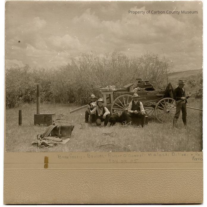 Update 2008: Black and white print mounted on dark tan matboard. Written beneath print on matboard in pencil: Verne Ferris, Bruiser, Rosco O'Donnel, Malachi Dillon, Ray Ferris. Print depicts two boys and two men in the countryside with short vegetation on foreground and brush in the near background with wide expanse to horizon in far background right. On side left is a cylinder metal stove pipe in upright position on the ground with a rectangular metal wood stove with high stovepipe attached to its top left. A saddle lies on the grass in foreground side left. A large wagon with seat in front for two and a wooden table attached at rear, a large box in wagon with lid open is at near rear of wagon and the tongue of the wagon is lying on the ground. A boy wearing dark pants suit and light high crowned hat seated at rear of wagon on an object holding a light colored dog in front of him. the second boy is dressed in dark pants, vest, a patterned dark scarf is tied at his neck, light shirt and hat is kneeling with a rifle propped up on ground and held by his right hand. A cartridge belt is thrown over his right shoulder. A black dog is to his left as is a man sitting on a wooden box dressed in dark pants, vest, striped light shirt, tie and hat holding a rifle across his knees. A man dressed in high top laced boots with his pant legs tucked in, dark shirt, tie an lighter hat is wearing a cartridge belt around his waist with pistol and holster on side right. He is holding a rifle with a long barrel across his waist at front. Painted on side wall of wagon: Studebaker. At top edge right is printed: J.W. Hugus and Co. Rawlings [sic] Wyo. a dark jacket is hung to side of buggy front with a high buggy whip next to it.