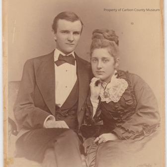 Sepia studio portrait of seated man & woman. Man on left is wearing a dark three piece suit, white shirt, dark bow tie. Woman on right is wearing a dark, ruffled, long dress with a white decorative lace collar. She has on a necklace & rings on both hands. Her hair is pinned up with a circular braid on top of her head.
