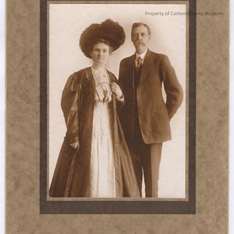 Black & white print on a mottled tan mat with a dark brown border beside print. Image of a woman & man standing. She is wearing a long, light colored dress with a tall collar & a dark satin looking overlay coat. She has on a dark, large, feathery hat & wears a necklace of slender chain & dangle. The man has a dark three piece suit, print tie, & white stiff collar shirt. He has a full mustache & his hair is parted on his left & combed down.