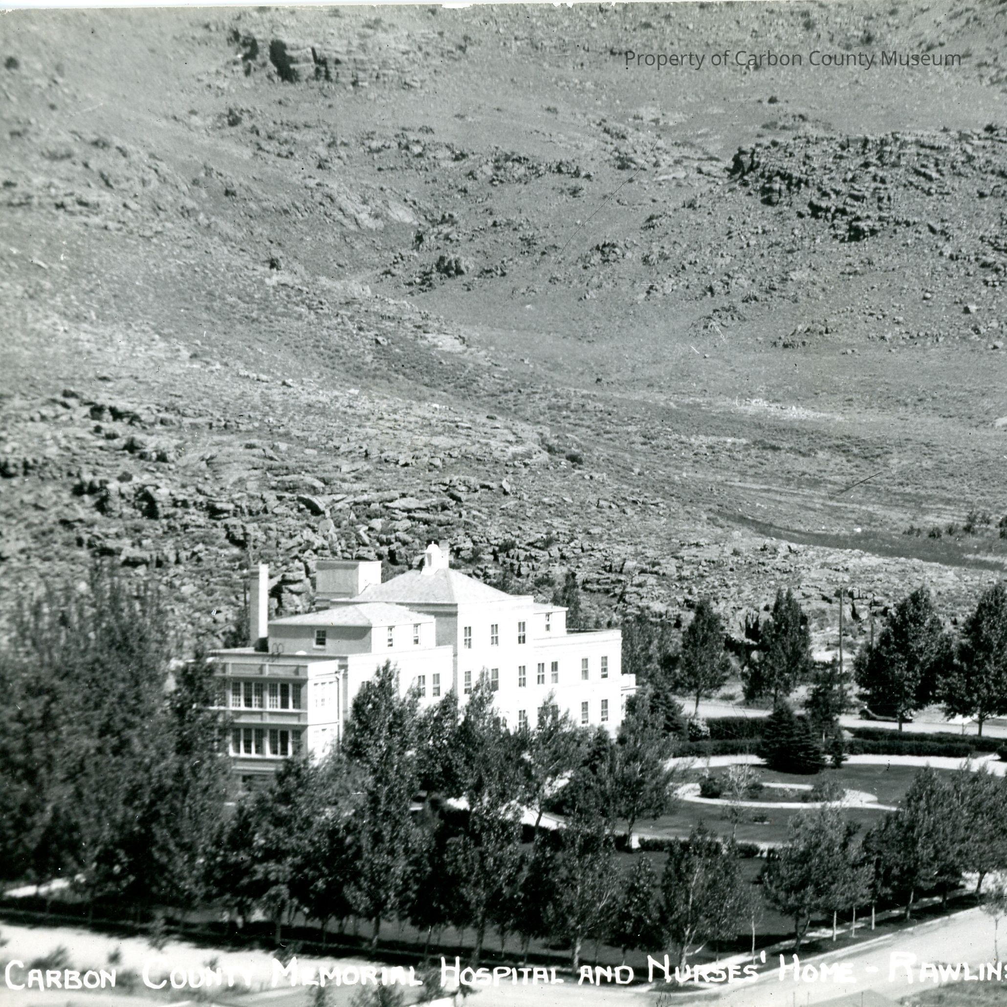 Postcard featuring a black and white aerial image of the old hospital (currently Cathy Gardens Apartments). White text along the bottom edge of the postcard reads "CARBON COUNTY MEMORIAL HOSPITAL AND NURSES' HOME - RAWLINS, WYO." In the bottom right corner is a logo and the serial number "Y-1347". On the reverse are the words "POST CARD", "CORRESPONDENCE" and "ADDRESS".Collection