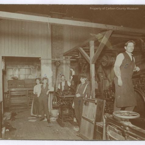 Update - 2009: Sepia print. Mounted on grey matboard. Image of five people - four men & one woman in a room full of machinery. Small room in back left with thin drawers like those used to hold type for printing. Men are in shirtsleeves; woman is wearing a dark apron.