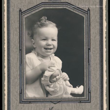 Laughing baby in white dress holding a doll. Taken in Rawlins by Meyers.