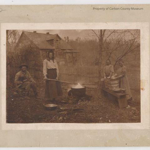 Update 2008: Sepia print. Photo of three ladies washing clothes and a man sitting in a chair. Man is leaning forward a bit with his left arm, hand facing up in his lap. He has on a hat and jacket (work). One lady is standing in front of a big pot over a fire. She has a long handled stick with which she is stirring the clothes. To the right are two ladies standing to the right of a wooden bench upon which are two lard barrels. These two ladies appear to be hand washing something inside the two barrels. There is a big two story house in the left background with a wooden fence between the house and the people.
