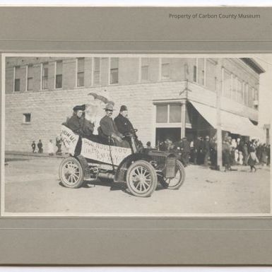 Update 2009: Black and white print (and two copies) affixed to gray matboard. Print is of an open vintage car with two women in the back seat, one dressed in dark clothing and hat, in dark clothing, but has a white hat and collar. She holds an open parasol. There are two men in front seat. Man driving car is wearing medium dark coat, leather driving gloves and high crown hat. Large man next to him is wearing dark clothing and a fez with Korein (?) logo on it. A sandstone and brick building is seen in the background. It has many vertical windows on top story and a canvas awning extending from building front edge over sidewalk at an angle. A crowd of children, men and women are standing in front of the building. Some children are seen at sidewalk side left. A sign is attached to the car that reads "How would you like to play in my yar(d)? A sign on vehicle back is unreadable except for "How me the". Roadbed is packed dirt.