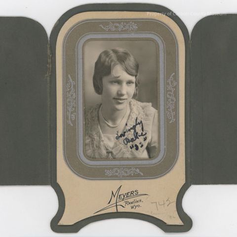 Young woman with pearl necklace. Lovingly: Babe, 1932. Taken in Rawlins by Meyers in folding frame.
