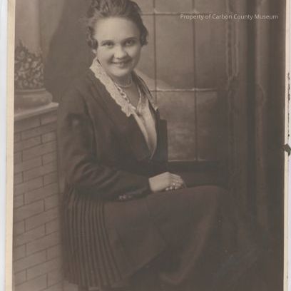 Update 2008: Sepia print. Photo of a young lady sitting on a chair in a dark colored suit. Jacket has lace down edges of lapel. Blouse can be seen in opening of jacket. Lady has on a single strand of pearls. She has her hands in her lap and her left leg crossed over her right leg at the knees. Blouse has a scalloped neckline. Her hair has pin curls on each side of her head, rest of hair is combed back high on her head. Lady has a ring on her little finger and ring finger of her left hand.