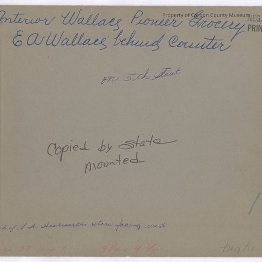 Written on back: [blue ink] "Interior Wallace Pioneer Grocery E. A. Wallace behind counter" "on 5th Street" [black ink] "copied by State mounted" [blue ink] "back of F W Woolworth's's store facing west" [red pencil] page 33, pix 1 3 1/4 x 4 3/4" [pencil] "Neg No 6653".
