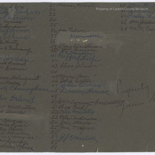 Written on back in black and blue ink: "1. Wesley S. Cox. 2.[unreadable]. 3. Geo Peterson. 4. Tom Byrnes. 5. R. Richardson. 6. Jerry O'Connor. 7. Roy Elkins. 8. Bob Hintz. 9. John C. Gunning. 10. [blank]. 11. Geo Jordan. 12. James Friend. 13. Wm. Cronin. 14. Peterson. 15. Oscar Holerquist. 16. Jim Healey. 17. Mike Bermingham. 18. [blank]. 19. John Friend. 20. [blank] 21. Henry Wallerstein. 22. Wes Spencer. 23. [blank]. 24. Wm Edwards. 25. Charles Lynch. 26. Peter Block. 27. Red Achieson[?]. 28. Mike Magner. 29. Wm. Lackay. 30. Nichola Yhrew. 31. Thomas Roberts. 32-35 [blank]. 36. Jim Nelson. 37. Rasmussen. 38. [blank]. 39. Claus Christenson. 39 1/2 Wm Gamon. 40. H.A. Hanson. 41. Clifford Keefe. 42. [blank]. 43. Chas. Johnson. 44. [blank]. 45. Harry Vann. 46. John Contos. 47. John Owens. 48. Dennis House. 49 [blank]. 50. Em Turney-Foreman. 51. Tho. Reid. 52. Peter Donnelly. 53. Pet Anderson. 54. Jim Hayes. 55. Jim Magner. 56 [blank]. 57. J.J. Omelia. 58-59 [blank]. 60. John Hukey. 61. Fred Hubbard. 62. James Hamilton. 63. Wm. Jordon. 64. M.D. Cronin.