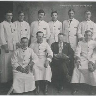 Black & white contact print of twelve men, eleven of them are in white tunic jackets & white aprons & one is wearing a dark suit, printed vest & tie & white shirt. Seven men are standing behind five seated. Man in suit is seated in the middle holding a tray with unidentified contents on top. Tunics have dark bands at neck, cuffs & on pocket.