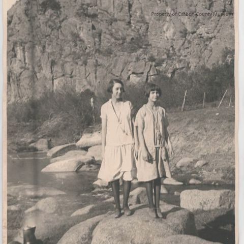 Update 2008: Black and white print. Photo of two young ladies standing on a large rock besides a stream. There is a large rock hill in the background. Ladies are in knee length short sleeved dresses. Each dress has a long sailor type scarf around the neck and down the bodice. Both have short hair styles. In lower left side of photo is a coffee pot on a campfire.