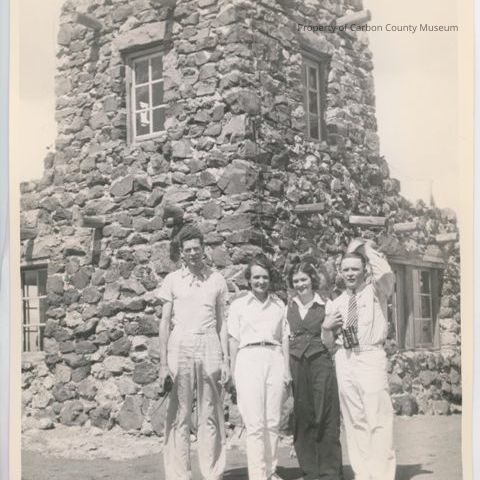 Update 2008: Black and white print. Photo of two couples in front of a rock building. They are standing in a line with the ladies in the center and a man on each end. Both ladies have on long pants and short sleeved blouses. Man on left has on short sleeved shirt and pants and man on right has on long sleeved shirt, ties and pants. Man on right is taking off his hat. Back building appears to be a two story, maybe a cabin.
