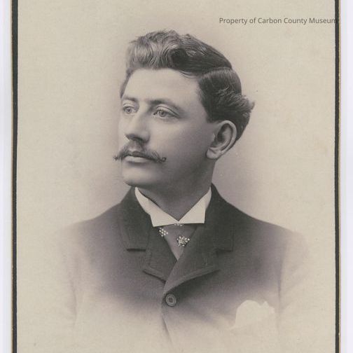 Black & white scan copy of a distinguished looking man. He has dark hair parted on left, a full mustache & looks toward photo left. He wears a dark suit coat, top buttoned, a white stiff collar shirt with print tie & tack. A handkerchief protrudes from a pocket on left side of jacket.