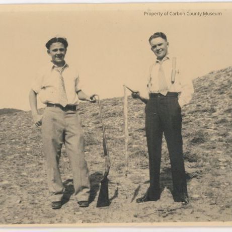 Update 2008: Black and white print. Photo of two young men standing on small hill. the man on the left has his right index finger in the barrel of a gun, which is standing on the gun butt stock. Man on right is holding what appears to be a snake with a stick. Snake is full length. Both men have on suit pants, ties and dress shirts.