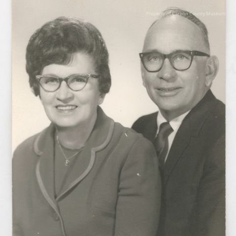 Update 2008: Black and white print. Bust photo of a man and lady in suit . Lady has a medium colored jacket and blouse. Man has a dark colored jacket, tie, and white shirt. Both have on eye glasses. Lady's hair is combed back and to left with a wave on left forehead. Man's hair is thinning and back off forehead.