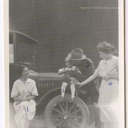 Update - June 2010: Black & white print. Snapshot. Image of two women, one man & a child posed on a vintage automobile. Child is perched on the front fender & is being held by the man. Man is wearing a dark suit, gloves & hat. Women are dressed in white; women on left is sitting on the running board; woman on right is standing. Blue ink numbers on each person written on emulsion.