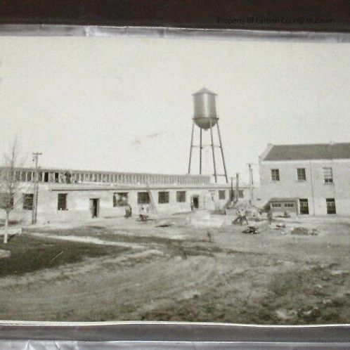 Black & white print of buildings inside the walls of the Wyoming State Penitentiary. On photo left is the top of a wall going toward a guard tower, wall can be seen proceeding toward photo right. A two story building with front enclosed entry, outside stairs & front landscaping is next. a long, 1 1/2 story building with multiple windows on top level next, & behind that is the water tower. Another two story building is attached by an enclosed walkway to a large cell block series of attached buildings laying perpendicular to the two story. Foreground is dirt with wheel tracks & some construction material in center. Several men are working by the material & on the 1 1/2 story building.