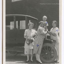Update - June 2010: Black & white print. Snapshot. Image of three woman & a child, posed with a vintage automobile. Child is standing on the front fender & is being held by the woman at center; woman is wearing a checkered dress. Other two women are dressed in white; one on the left is holding a medium-colored piece of clothing. Blue ink numbers on each person written on emulsion.