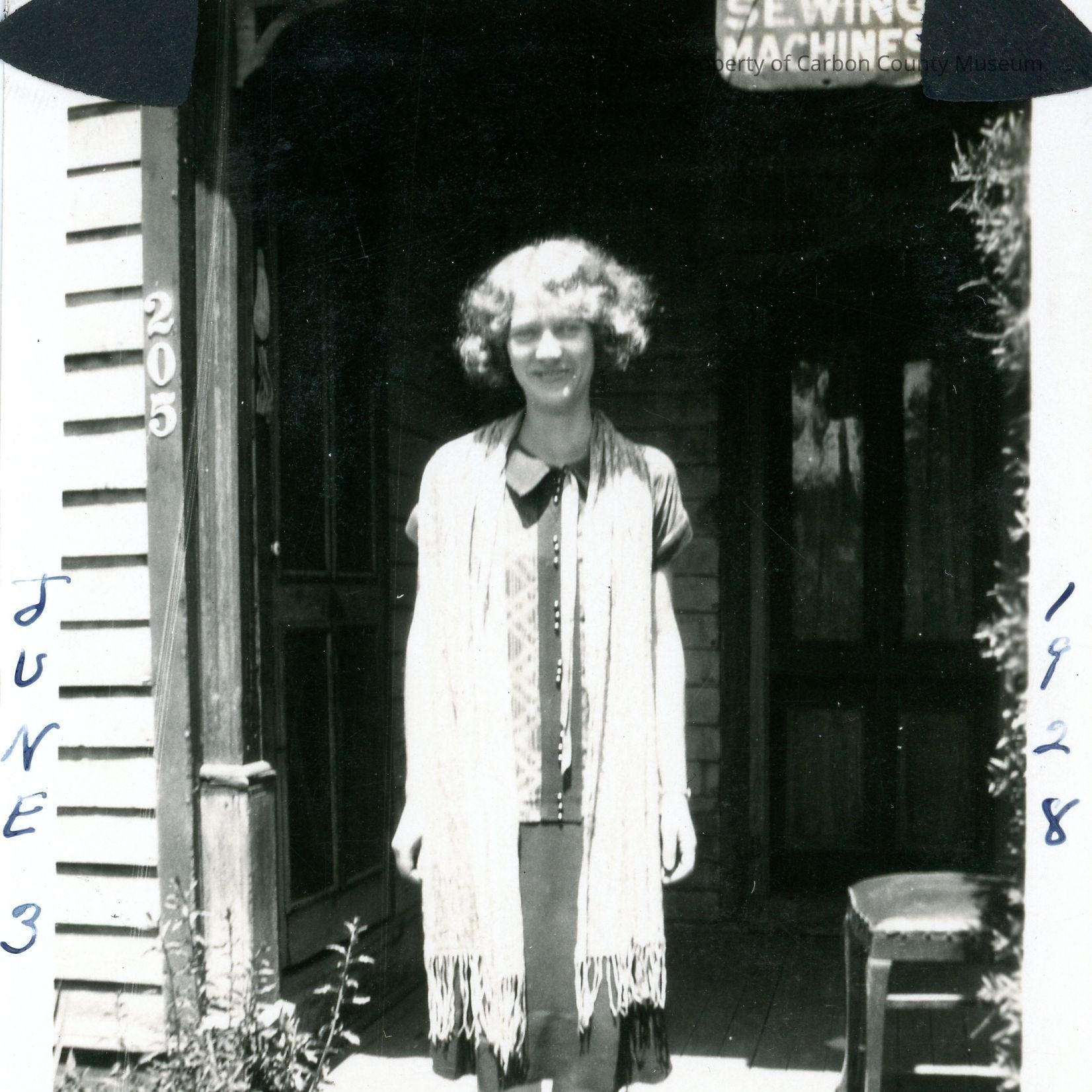 Black and white photograph. A young woman is standing outside of a building, above her is a sign that reads in part "SEWING MACHINES". Written along the top edge of the photograph is "RAWLINS", along the bottom "DORTHEA GILLESPIE", vertically along the left edge "JUNE 3", vertically along the right edge "1928". The number 4 is printed on the back, also present is a circular green stamp that reads "MEYERS PHOTOS PHOTO FINISHING RAWLINS, WYO".Collection
