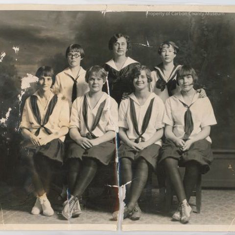 Black & white print of a girl's basketball team. There are four girls seated & two standing behind them on either side of a woman coach. Girls are wearing dark bloomers, socks & ties with a white shirt. Coach is wearing a dark shirt & tie with a white collar. Girl in back on right has a dark collar with white stripes.