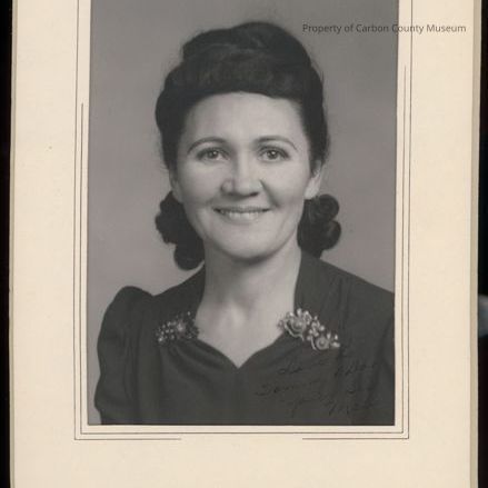 Update 2008: Black and white print. Bust photo of a young lady in a dark colored dress with low neck line. She has what appears to be two brooches, one on each side of the neck line in shoulder area. Her hair is dark colored and has large wave on top, rest is combed back and appears to be tied in back with curls running down the back of her neck.