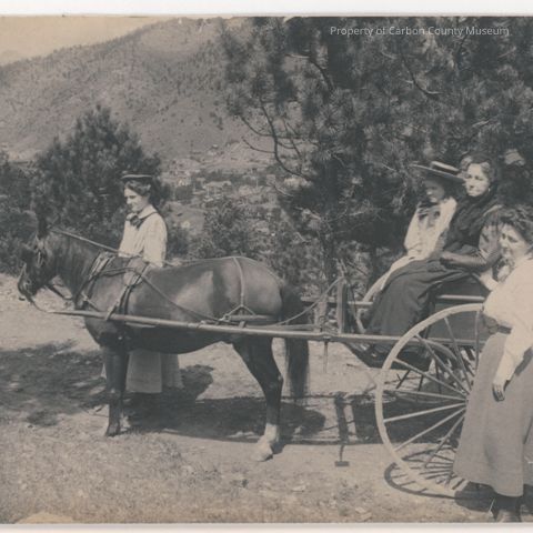 Black & white print of four women & a horse drawn, two wheel cart. One woman stands behind the horse, two are in the cart, & one stands beside the wagon wheel. They are wearing long skirts & long sleeve blouses. Two of the women have hats & one a dark scarf. An elderly woman & a young girl are on cart seat. They are on a timbered hill overlooking a town below & mountains are in the background.