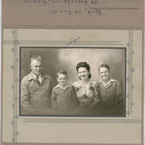 Update 2008: Black and white print. Bust photo of a family of four people. Far left is man in a jacket which is zipped closed . He has on a Tie and white shirt. Hair combed back in waves. To his right is a small boy in a jacket that buttons. Collar of shirt is over top of jacket collar. His hair is parted on right and waves to left . To his right is a lady in a floral print dress with a brooch in center of neckline. Her hair is combed back in a big wave, tied back of neck line and lays in burls to her shoulders. She has on earrings. To her right is an older boy in a button jacket with collar of skirt over jacket collar. His hair is parted on left and combed to right side in a wave.