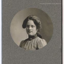 Update 2/2008: Sepia print. Studio portrait. Circular. Mounted on grey matboard with black edge. Image of a young woman in a light colored dress with pattern of small white flowers. There is a dark scarf around her neck tied in back. her hair is up and she is wearing glasses. Embossed on the mat in lower right: "Throbeck 227 16th St. Denver, Colo."