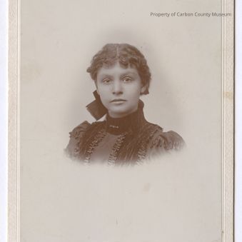 Update 2009: Sepia print. Photo of a young lady in a dark colored dress. her hair is parted in the middle and lays in small waves on the sides, which is pulled back and held at the neck line by a big bow. She has small hands. She has on a high collar and dark colored dress. Collar is round (like turtle neck) made of velvet?. There are large velvet? stripes from the shoulder running down each side of the front of the dress. There is gathered ribbon running beside velvet? strip and also across the top part of the sleeves. She has a small pin attached to the front of the collar. Photo is mounted on mat board.