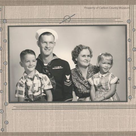 Update 2008: Black and white print. bust photo of a family all seated. the man is on the left holding a young boy. Man is in a full navy suit with navy cap. He has on glasses. Boy has on plaid shirt. Lady is holding a little girl in a plaid dress. Lady has on print dress with V shaped neck line with brooch at V point. Lady has on glasses.
