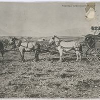 Black & white print on cardboard mat of stage coach & six horses. Five men & one boy are sitting on top & in driver's seat. White canvas covers a portion of top of stage. Written on side of stage: "182" "C & W" "S. M. & EX Co."