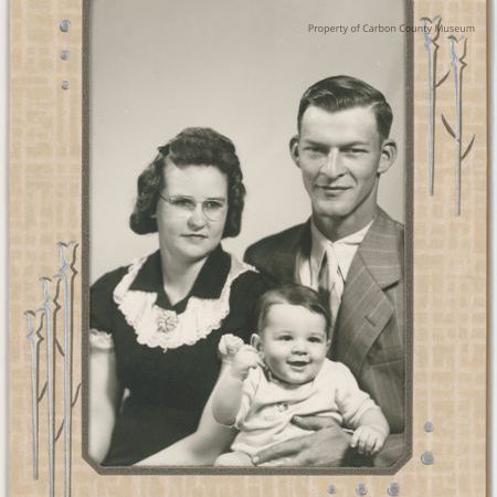 Update 2008: Black and white print. Bust photo of a man, lady and little boy. Lady is on left of photo in a dark colored dress with a large white lace bodice collar. Her hair is dark and combed back in waves in a short hair style. Man is to lady's right in a medium colored large pin striped suit with light colored shirt and tie. His hair is parted on the right and combed to the left. Man is holding a baby boy on his lap. Baby is in a light colored one piece play suit.