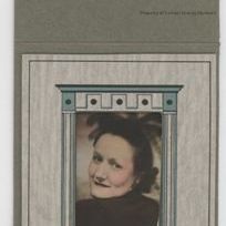 Print in folder that closes from top to bottom. Photo indented in center section has pillar type design around edges. Written in blue ink on lower right corner: "Love Thelma."Collection