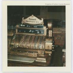Color print of a cash register. An attached sign on top of register reads: "Bennett Hardware Co." On register drawer: "National" Cash register is a gold color with red, black & white keys.