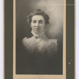 Update - January 2010: Black & white print. Studio portrait. Mounted on dark green & tan matboard. Head & shoulders image of a young woman wearing a light colored dress with a high collar & ruffled yoke. Her hair is pinned up. Painted backdrop behind her.
