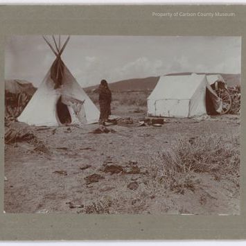 Written on back in blue ink: "Indian Camp - [cut off] or Shoshonies[sic] {SHOSHONES][.] These Indians came through Rawlins almost every year after visiting with [cutoff] other tribe of Indians and always camp south of the Railroad tracks at the east end of town where the slaughter house used to stand. Picture taken sometime between 1900 & [cut off] [.] Given to Museum by Mrs. Ed T Bennett.[.] "copied by State 39%" "3"