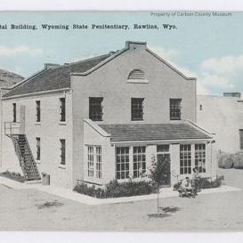 Black & white print card with blue sky. Image of a two story building with front entry that juts out on front of building, that is only one level. Entry has large windows on front & sides, with multi divided panes, & front door. Outside stairs are attached to building & lead to a door on upper level on photo left. Front upper level has three windows & photo left side has three windows on upper & lower level. Bars are on all windows except entry. A walk surrounds the building. Two small trees & some bushes are in front of the building. Two men are on a bench in front. Printed at top of card in black: "1. Hospital Building Wyoming State Penitentiary Rawlins, Wyo"
