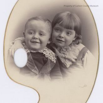 Update February 2011: Black & white studio portrait on a white mat of two young children. It is head & shoulders pose with girl's right arm around a boy's shoulder & her cheek touching his head. They are both dressed nicely. Mat is in the shape of a painters pallet complete with hole. the edge is trimmed in gold.