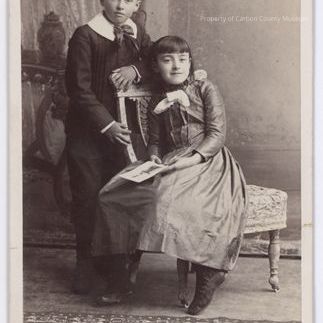 Update February 2011: Black & white studio portrait of two children. A boy wearing a dark suit with large white collar & bow tied at neck, stands behind a chair. A girl sits in the chair holding a picture. She wears a dark dress with white bow tied at the neck. The chair has a carved wood back, upholstered seat & wood legs with casters. Background is a studio prop.